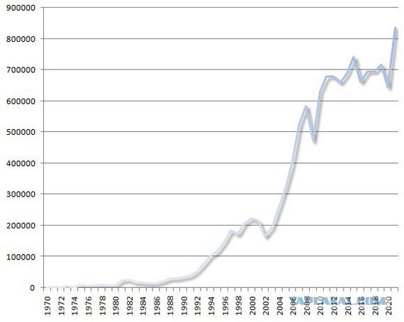 Мировая экономическая статистика практически всегда подтверждает те или иные положения марксизма. На графике - прямые иностранные инвестиции в развивающиеся и переходные экономики в 1970-2020 гг. (в млн. долл. США). Инвестиции стран Запада в экономики развивающихся стран резко возрастают после распада СССР, так как падение коммунизма означало сведение к нулю опасность национализации западных предприятий, построенных в развивающихся странах. Падение СССР открыло для Запада доступ к дешевой рабочей силе (можно занижать зарплаты местным рабочим, так как советской альтернативы больше нет), а также дало возможность перенести в развивающиеся страны экологически грязные производства (опять же потому, что нет Союза, который смог бы с этим бороться идеологически и экономически).